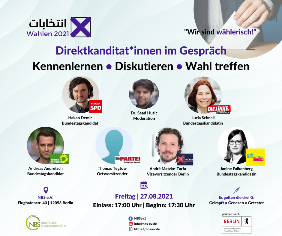 Zwischen dem 20.08.2021 und dem 24.09.2021 werden verschiedene Veranstaltungen rund um das Thema "Wahlen 2021" bei uns in der Flughafenstr. 43, 12053 Berlin angeboten!