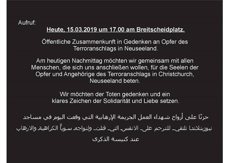 Über 200 Menschen folgten unserem Aufruf und versammelten sich mit Kerzen am Breitscheidplatz. Sie gedachten der Opfer des rechtsradikalen Terrors in #Christchurch, Neuseeland und zeigten ihre Anteilnahme. Gemeinsam beteten Sie für die Seelen der Opfer und Angehörige des Terroranschlags und setzten ein klares Zeichen der Solidarität und Liebe.