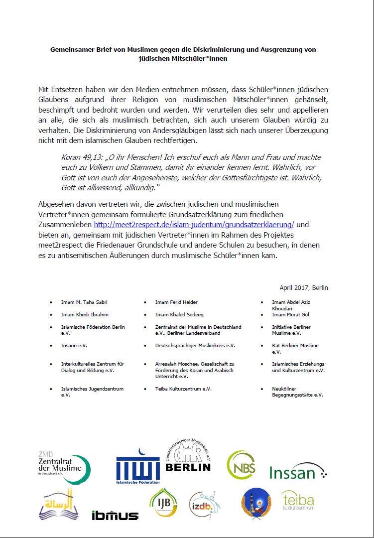 Abgesehen davon vertreten wir, die zwischen jüdischen und muslimischen Vertreter*innen gemeinsam formulierte Grundsatzerklärung zum friedlichen Zusammenleben http://meet2respect.de/islam-judentum/grundsatzerklaerung/ und bieten an, gemeinsam mit jüdischen Vertreter*innen im Rahmen des Projektes meet2respect die Friedenauer Grundschule und andere Schulen zu besuchen, in denen es zu antisemitischen Äußerungen durch muslimische Schüler*innen kam.